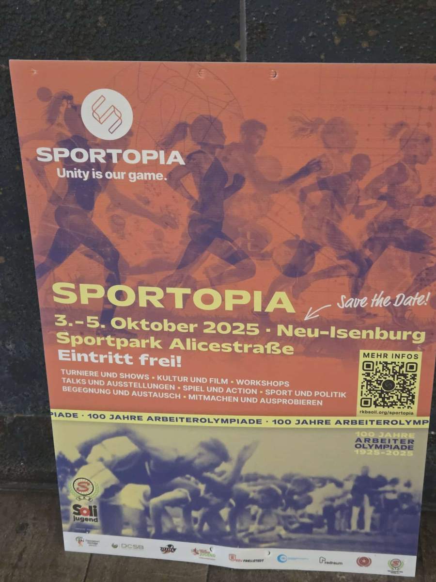 Bei der Sportopia handelt es sich in Gedenken an die erste Arbeiterolympiade 1925, um ein Sport- und Kulturfest bei dem alle ohne Leistungsdruck mitmachen können. Neben dem sportlichen Charakter möchte dieses Event den Sport in einem größeren gesellschaftlichen Kontext stellen. Das Event hatte Vor-Ort ein breites Sportprogramm geboten bei dem auch spontan einzelne ALFFM dankbar teilnahmen.